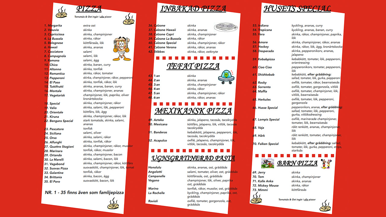 Lombolo Pizzeria & Grill , En väl inarbetad och aktiv Restaurang med hela 22 års erfarenhet inom Pizza branschen. Lombolo Pizzeria & Grill har haft samma ägare sedan år 2004.Personalen strävar alltid efter att ha bra kvalité god service och framförallt nöjda kunder. En av Lombolos signaturrätter är deras Oxfilé Pizza, en pizza toppad med Oxfilé , Marinerade champinjoner med färskvitlök & kryddor ,Tomater , Lök & Beasås. De erbjuder också en mängd andra pizzor och maträtter. Restaurangen är bekvämt belägen med gott om parkering. Mixa egen Pizza Beställ större order till företag, föreningar, fester eller födelsedagar Vi har utkörning inom Kiruna ( OBS! Hinder kan förekomma beroende på Tid & möjlighet till utkörning ) Minsta order 2-3 maträtter för utkörning . Utkörnings avgift tillkommer . Vi har även utkörning till Tågstation. Vi tar KORT. Vi tar även SWISH. Vi tar även emot rekvisitioner och faktura Välkommen till oss på LOMBOLO PIZZERIA & GRILL där bara fantasin sätter stopp.